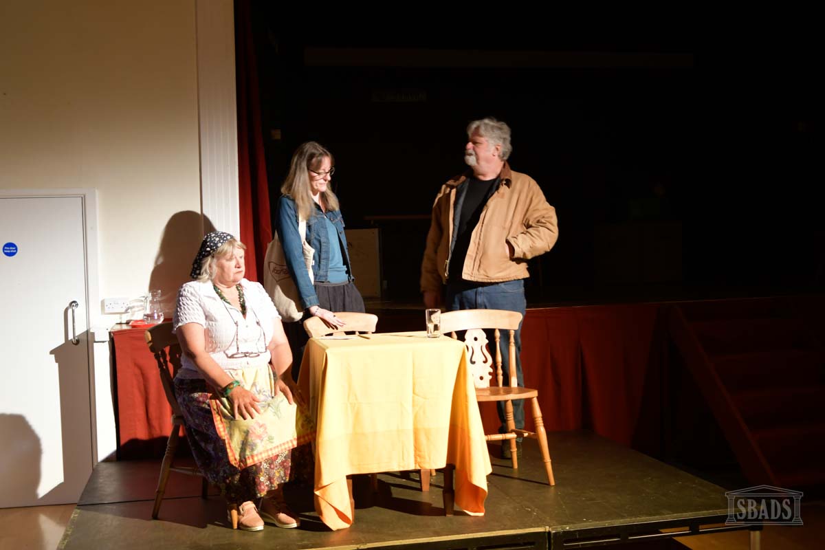 - At a rehearsal in the barn: Sharon Hughes as Mary, Alan Prince as Denis, Guy Rapson as Nigel (A Bunch of Amateurs, SBADS 2025)