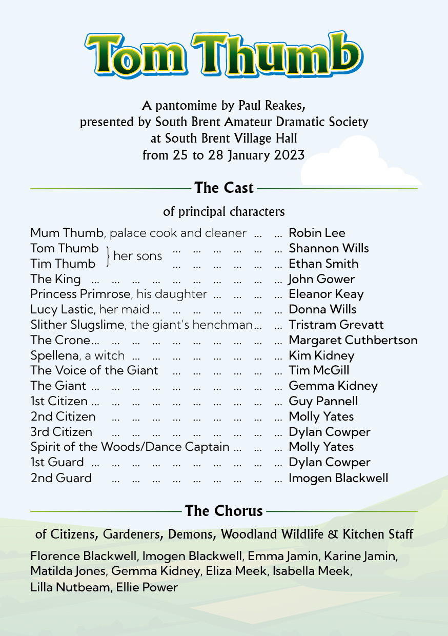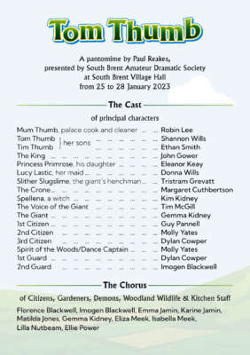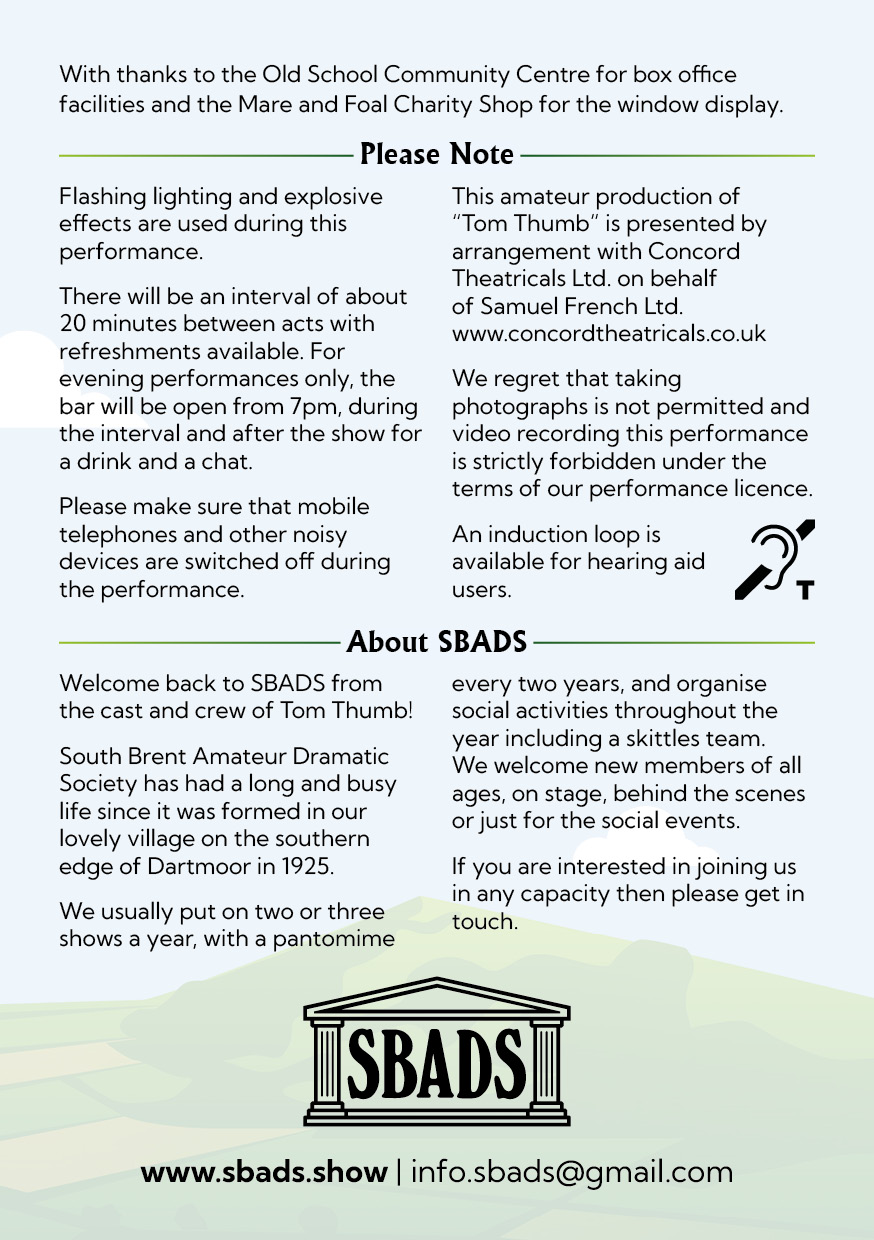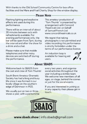 SBADS was forced to suspend its usual programme of productions in 2020 due to the Covid-19 pandemic. 'Tom Thumb' was the first production for three years, and a triumphant return to the stage for the society as it played to full houses.
